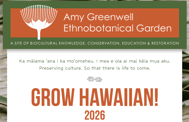 The Garden bequeathed by Amy Greenwell to Bishop Museum for the purpose of conserving an example of the historic Kona Field System and curating a collection of native (endemic and indigenous) and Polynesian-introduced “canoe” plants used for food, fuel, fiber and medicines.